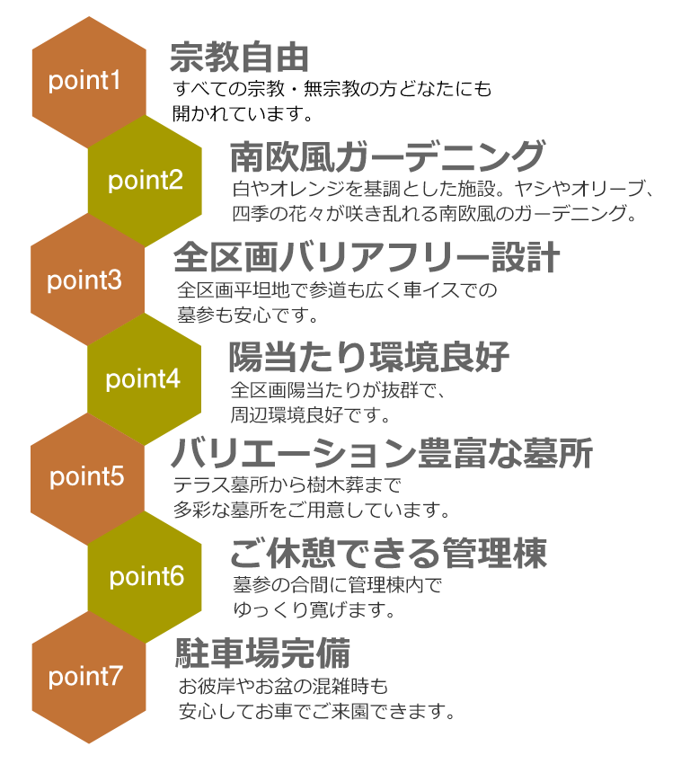 | 特色 | 宗教自由 園内全てバリアフリー設計 寄付金は一切不要 浸透性通路を使用。雨の日も安心してお参りいただけます。 全区画平坦地。車椅子の方やお年を召した方も安心です。 設計自由。 お好みのデザインで建墓いただけます。 駐車場完備。混雑時も安心な大駐車場を完備しています。 |